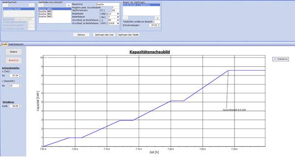 Der Bedarf warmen Trinkwassers wird grafisch ermittelt als eine sogenannte Bedarfskennlinie. Trägt man nun in dieses Diagramm ein, welche Warmwassermenge und welches Leistungsangebot zur Nacherwärmung zur Verfügung steht, ist ein Vergleich möglich. Dann gilt logischerweise als weiser Schluss dieses Vergleichs: Falls der Bedarf geringer ausfällt als das Angebot, ist die Anlage tauglich.