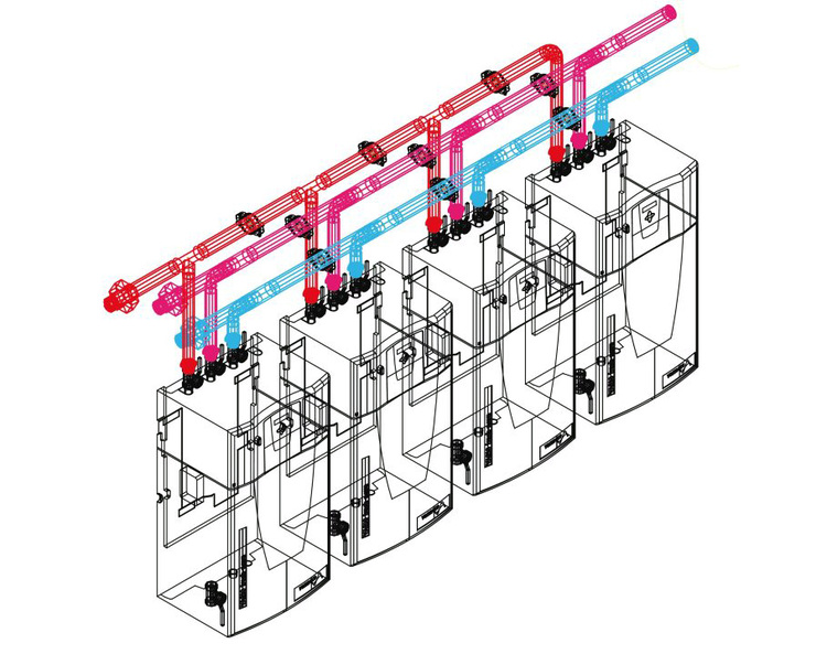 Der Basis-Verrohrungssatz ist für freistehende Zweier-Kaskaden geeignet und lässt sich mit einer Erweiterung auch für wandmontierte Module nutzen. Für Kaskaden mit mehr als zwei Trinkwassererwärmern stehen Erweiterungssets zur Verfügung. Die Innendurchmesser der Verrohrungssätze sind für Kaskaden mit Schüttungen von maximal 160 l/min konzipiert.