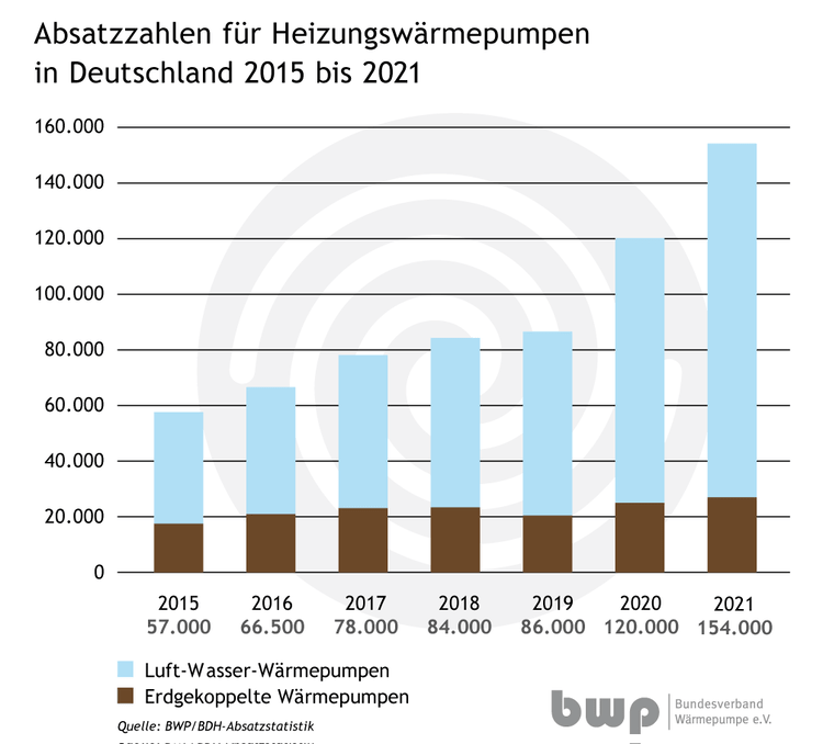 Ende Juni luden das Bundeswirtschafts- und das Bundesbauministerium zu einem digitalen Treffen von Verbänden und Unternehmen nach Berlin ein („Wärmepumpen-Gipfel“), um den Startschuss zur angekündigten Wärmepumpen-Offensive zu geben. Das Ziel: ab 2024 bundesweit mindestens 500.000 Wärmepumpen jährlich zu installieren statt der ca. 154.000 im Jahr 2021. Der Fokus liegt auf Luft-/Wasser-Wärmepumpen, die im Vergleich zu anderen Wärmepumpensystemen relativ günstig in der Anschaffung sind. Die Ampel-Koalition plant, den Bestand an Wärmepumpen auf 6 Millionen Anlagen bis zum Jahr 2030 auszubauen. Laut BDH sind zurzeit in Deutschland rund 1,1 Millionen Wärmepumpen installiert.