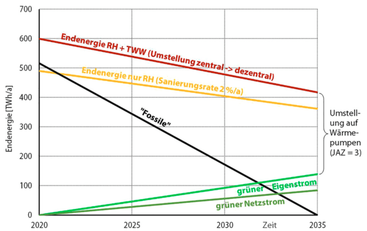 - Endenergieverbrauch 2020 für Raumheizung (RH: 490 TWh/a) und Trinkwarmwasser (TWW: 110 TWh/a) inkl. Aufwand für Erzeugung, Speicherung und Verteilung – davon 86 % überwiegend fossile Energien – vereinfacht lineare Degression bis 2035 auf 417 (RH + TWW) bzw. 362 TWh/a (nur RH) durch Modernisierung und Sanierung: Instandhaltungsmodernisierung.