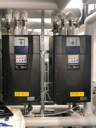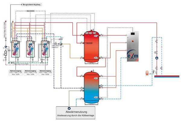 Die Exergiemaschine ist eine Wärmepumpe, die im Gegensatz zu einer konventionellen Heizungswärmepumpe für relativ hohe Temperaturen und große Temperaturhübe ausgelegt ist. So kann sie als „Turbo" in der Heizzentrale eingesetzt werden, der in diesem Fall die Abwärmetemperatur von 38 °C auf etwa 68 °C anhebt – ausreichend für die hygienische Trinkwasserbereitung in den drei sogenannten Frischwasserstationen (Wasser-Wasser-Durchlauferhitzer von varmeco und BMS).