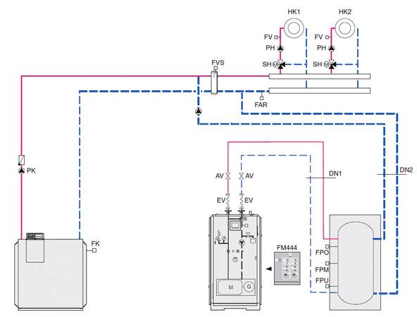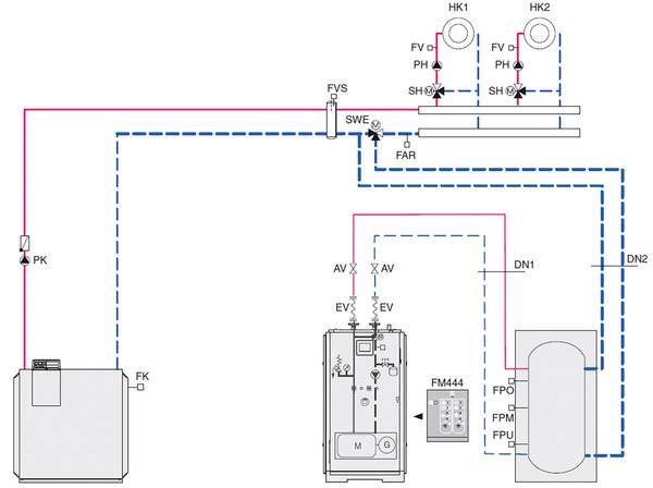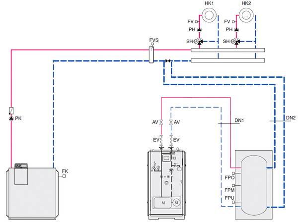 Entscheidend für die Regelung einer solchen Hydraulik ist die richtige Platzierung des Strategiefühlers FVS, der die Gesamtvorlauftemperatur erfasst. Ist dieser so platziert, dass er vom Vorlauf des Puffers angeströmt wird, führen die vom Fühler zu hoch gemeldeten Temperaturen zu einer Reduzierung der Kesselleistung und die Verbraucher werden unterversorgt.