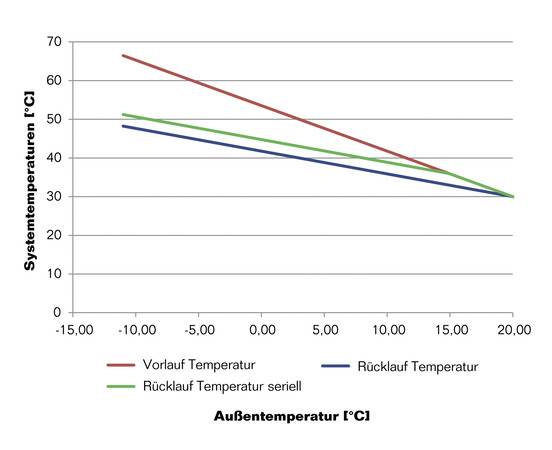 Schwieriger ist die Kalkulation des höheren Gasverbrauchs. Weil dieser aus der Temperaturanhebung des Anlagenrücklaufs resultiert, muss der Betrieb über ein Jahr simuliert werden. Entsprechend der Differenz zwischen Innen- und Außentemperatur ergibt sich die aktuelle Heizlast und damit die Spreizung zwischen Anlagenvor- und Anlagenrücklauf. Diese Rücklauftemperatur wiederum ist maßgeblich für den momentanen Wirkungsgrad eines Brennwertkessels. Wird der Pufferspeicher seriell eingebunden, erhöht sich die Rücklauftemperatur des Kessels entsprechend der Leistung des Grundlastwärmeerzeugers, wodurch sich der Wirkungsgrad des Brennwertkessels verschlechtert.