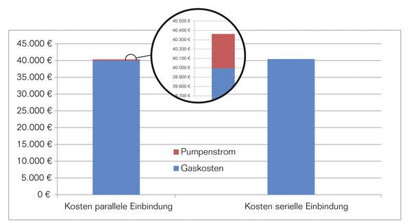 Der Gasverbrauch bei serieller Einbindung steigt entsprechend der Simulation um etwa ein Prozent gegenüber der parallelen Einbindung. Daraus resultieren Mehrkosten von rund 450 Euro pro Jahr bei einem Gesamtgasverbrauch von rund 40 000 Euro. Tatsächlich entstehen bei der seriellen Einbindung also Mehrkosten in Höhe von circa 80 Euro pro Jahr, dieser Betrag liegt unterhalb der Messbarkeit im realen Betrieb.