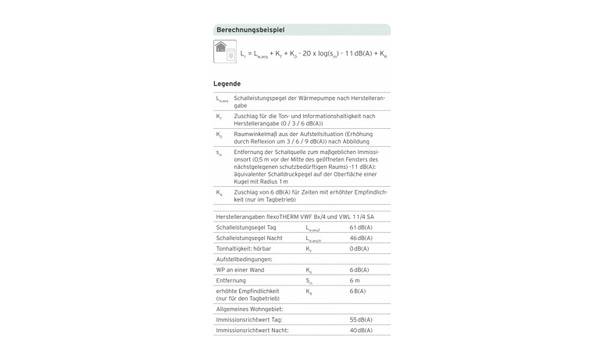 Vergleichbare Informationen bieten eigentlich nur die Schallleistungsangaben. Mittels der Schallleistung sind nicht nur die akustischen Eigenschaften eines Produktes zu beschreiben, sie ermöglicht auch eine direkte Gegenüberstellung unterschiedlicher Geräte eines oder verschiedener Hersteller. Der maximale Schallleistungspegel ist in deren Unterlagen sowie im BWP-Schallrechner (Produktliste) zu finden.