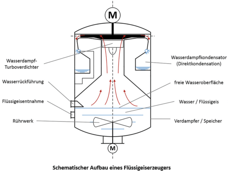 Durch die Verdampfung einzelner Wassermoleküle an der Wasseroberfläche wird der umgebenden Flüssigkeit fast 8-mal mehr Energie entzogen als es zum Vereisen benötigt. Da die Verdampfung bei etwa –0,5 °C im Bereich des Tripelpunktes im Vakuum erfolgt, gefrieren andere Wassermoleküle und bilden Eispartikel. Zur technischen Nutzung dieses Phänomens muss der Wasserdampf mit einem Verdichter aus dem Eiserzeuger abgesogen werden, wie es auch bei anderen Kältemaschinen (hier: Wasserdampf) zur herkömmlichen Kälteerzeugung erfolgt.