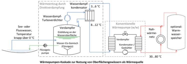 Beim Vakuumeis-Verfahren kann der Wärmeentzug sowohl durch die Abkühlung des Wassers als auch durch ein teilweises Einfrieren erfolgen. Dieser maßgebliche Vorteil erlaubt eine ganzjährige Nutzung des Wassers als Wärmequelle, also auch bei niedrigen Wassertemperaturen bis zum Gefrierpunkt!