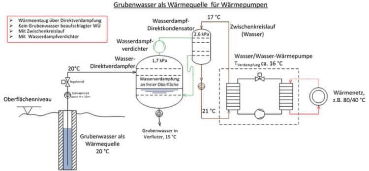 - Auch stark mineralisierte Wässer wie Grubenwässer lassen sich als Wärmequelle erschließen. Vorteil ist hier v.a. der Wärmeentzug durch Direktverdampfung und die Vermeidung eines grubenwasserbeaufschlagten und damit verschmutzungsanfälligen Wärmeübertragers. Je nach Grubenwasserwassertemperatur ist ein Betrieb ohne Vereisung sinnvoll. Das aus der Kondensation des reinen Wasserdampfes gewonnene Destillat kann ggf. als Nebenprodukt verwendet werden.