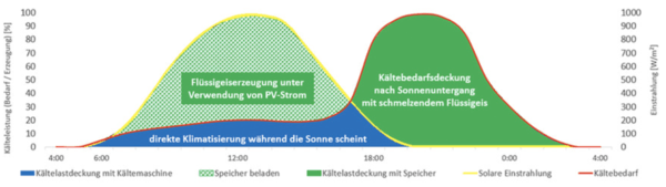 Ganz anders ist es bei der Vakuum-Flüssigeis-Technologie, in der der elektrische Aufwand dann erfolgen kann, wenn Strom (zum Beispiel aus Sonne und Wind) zu viel zur Verfügung steht, um die Kälte später bei Bedarf zu nutzen. Die Solaranlage auf dem Theaterdach produziert über Ihren Stromertrag dann am Tag die Kälte, um sie am Abend zur Klimatisierung zu verwenden.