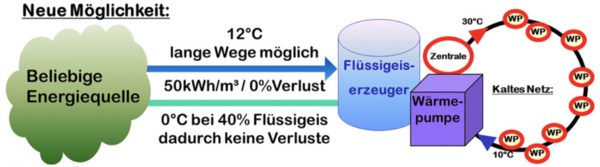 Die geringe Energiedichte bei üblichen Kaltwassernetzen (bei 6/12 °C ca. 7 kWh/m³) führt zu großen Volumenströmen, großen Rohrquerschnitten und signifikantem Pumpaufwand. Bis zu einem Eisanteil von ca. 25 Prozent kann Flüssigeis bei vergleichbarem Druckverlust problemlos zugemischt und gepumpt werden. Die Energiedichte steigt dabei um 500 Prozent! Entsprechend sinken Rohrquerschnitt und Pumpaufwand.