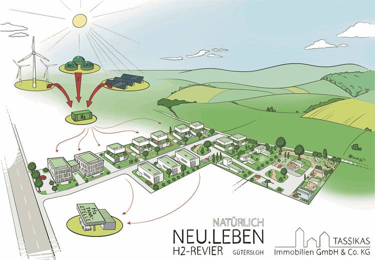 Im ostwestfälischen Gütersloh soll in den nächsten Jahren ein ehrgeiziges Stadtquartier entstehen, das seinesgleichen in Deutschland, wenn nicht gar in Europa sucht. Ein Komplex aus Büro- und Geschäftshäusern, 10 Mehrfamilienhäusern und einer Kita, dessen Strom- und Wärmeversorgung zu 100% auf Wasserstoff (H2) basieren wird. Hinzu kommt noch eine Wasserstoff-Tankstelle, die von jedem angefahren werden kann, also nicht dem Viertel vorbehalten ist. Den Strom zur Herstellung des Wasserstoffs (per Elektrolyse vor Ort) sollen Windräder, Photovoltaik- und Biogasanlagen liefern. Gespeichert wird der Stoff vor Ort mit 300 bar in einem Speicher (17.500 l Volumen), bestehend aus Gasflaschenbündeln.