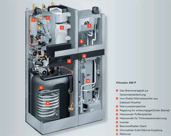 Hersteller bringen derzeit noch erdgasbasierte Brennstoffzellenheizungen auf den Markt. So hat Remeha das Brennstoffzellensystem eLecta 300 auf den Markt gebracht, das mit einer thermischen Leistung von 4,8 bis 20 kW für den Betrieb in kleineren Objekten geeignet ist, plus einen Gas-Brennwertkessel als Spitzenlastkessel dann inklusive. Das funktioniert auch, weil sich die Anschaffungskosten mit Hilfe staatlicher Zuschüsse am Ende tatsächlich rechnen lassen. „Mit bis zu 11.100 Euro über die KfW-Bank kommt dieses moderne Mikro-BHKW auf eine Preisgestaltung wie eine Wärmepumpe“, verlautbart Remeha.