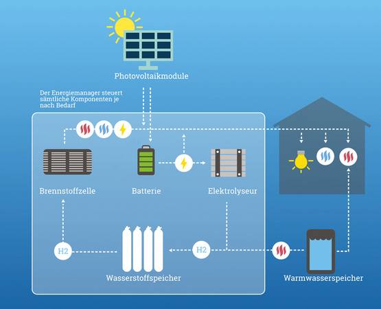 Um das Quartier mit Strom und Wärme aus Wasserstoff zu versorgen, werden in den Gebäuden Brennstoffzellen installiert. Außerdem wird ein Nahwärmenetz gebaut, das mit der Abwärme aus der Elektrolyse gespeist wird. Für Spitzenlasten sind im Geschäftshaus und in der Kita Wasserstoff-Brennwertkessel vorgesehen.