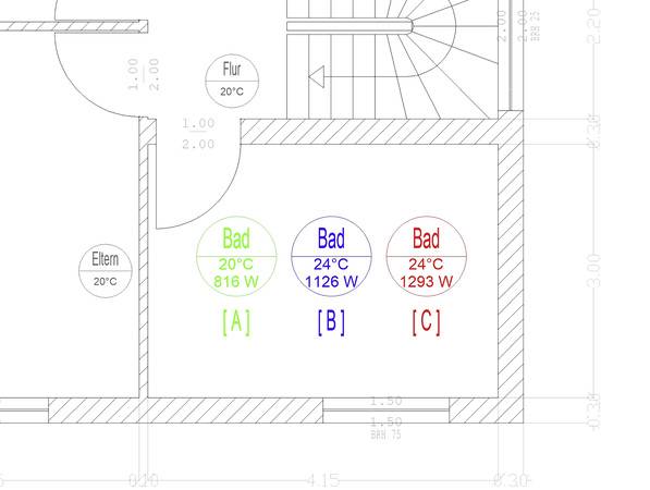 Die teilweise eingeschränkte Beheizung ist hierfür der passende Begriff. Nimmt man also realistisch an, dass das Elternschlafzimmer und der Flur nur auf 15 °C beheizt sind, erhöht sich nochmals die Heizlast des Badezimmers auf insgesamt 1.293 W. Entsprechend sind rund 104 W/m² zu stemmen.