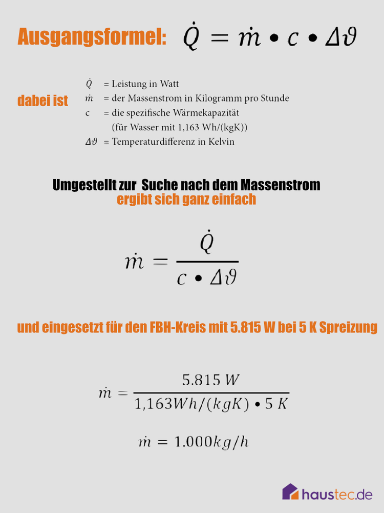 Die höchste Anforderung an die Vorlauftemperatur zur FHZ erfährt der Mischer natürlich im Winter. Zum Zeitpunkt des Auslegungsmaximums bietet der Kessel 70 °C an und die FHZ will 40 °C bekommen, wobei sich 35 °C im Rücklauf einstellen. Betrachten wir daher mal die rechnerischen Gegebenheiten für ein Wohnhaus mit 5.815 W Leistung sämtlicher Flächenheizungen zusammengerechnet. Die Spreizung zwischen 40 °C und 35 °C beträgt für sämtliche Kreise 5 Kelvin.