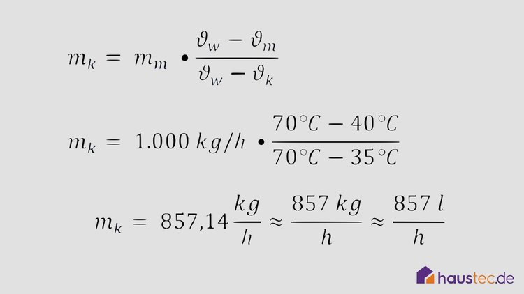 Mittels der Mischwasserformel lässt sich noch ausrechnen, welchen Anteil das heiße Kesselwasser mit 70 °C haben wird und welcher Volumenstrom aus dem kühlen Rücklauf mit 35 °C stammt.