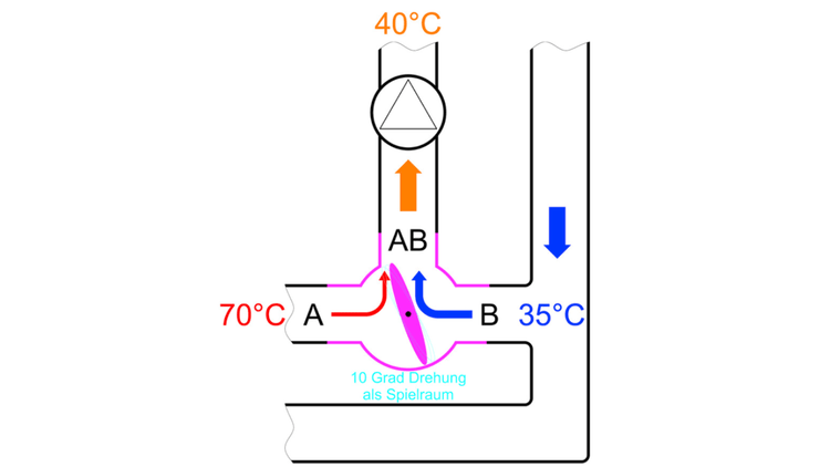 Verhältnismäßig viel kühles Rücklaufwasser wird genutzt, wenn der Drehschieber des Mischers auf kurz vor halb zwölf steht, denn dann ist das Tor B zu AB maximal geöffnet. Am meisten heißes Kesselwasser wird genutzt, wenn der Drehschieber kurz nach halb eins zeigt und daher das Tor A weit offensteht. Also kein Problem, würde man jetzt denken, dieser Mischer wird es schon mischen.