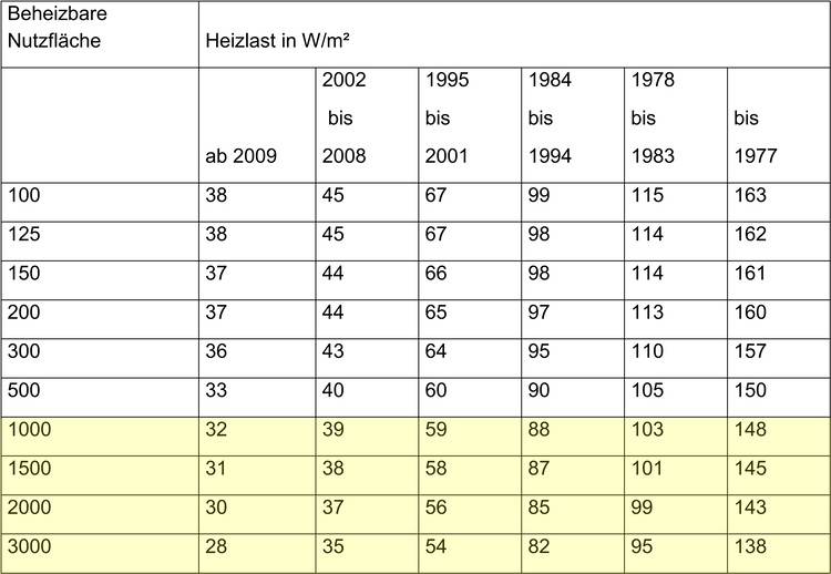 Die vorgestellte Tabelle kommt für drei Arten von Wärmeerzeugern infrage. Werden andere Wärmeerzeuger ausgelegt, sollte grundsätzlich eine Heizlast nach DIN EN 12831 berechnet werden.
