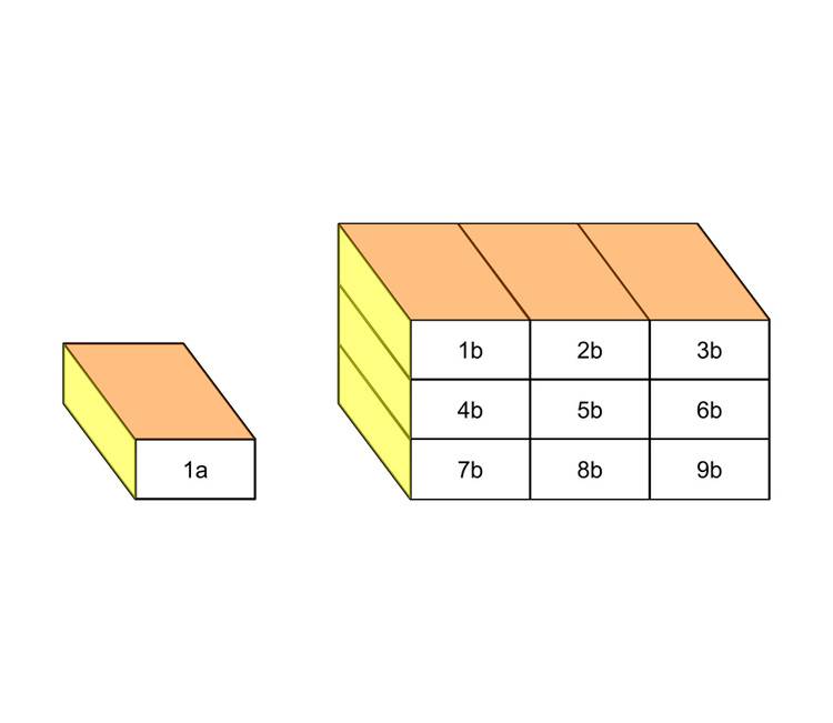 Sie können hierzu auch die Skizze von einem Bungalow untersuchen. Der Quader der Skizze hat die Längen 5 × 10 × 20 m und ist damit ein großzügiges Haus mit 200 m² Wohnfläche. Würde man den Bungalow vervielfältigen und sechsmal zu einem Mehrfamilienhaus verschachteln, hätte man 1200 m² Wohnfläche.