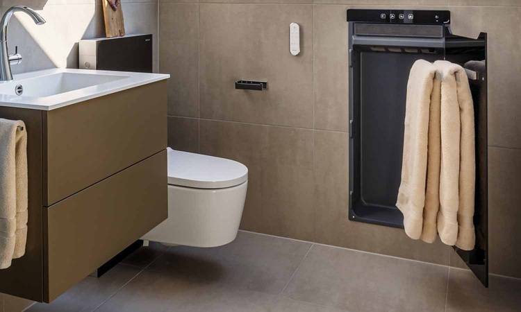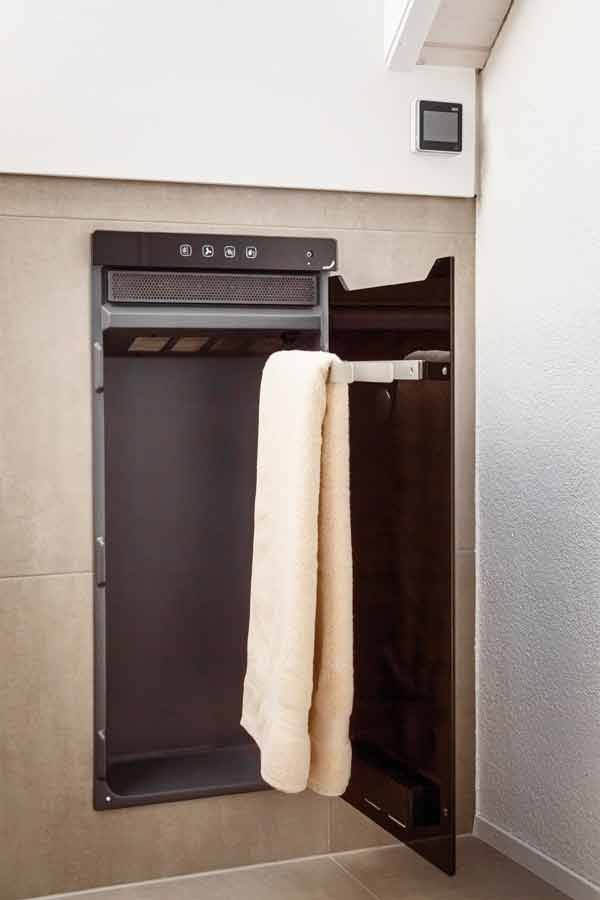 Hinter der Glasoberfläche können Textilien hygienisch getrocknet werden, wobei die Schnelltrocknungs-Funktion aufgrund stark verkürzter Trocknungszeiten die Keimbelastung auf feuchten Badtextilien deutlich verringert. „Besonders meine Frau liebt Zehnder Zenia heiß und innig. Sie nutzt das Wärmekomfortgerät zum Wärmen ihrer Badetücher vor und nach dem Duschen. Sogar unsere extra flauschigen und voluminösen Badetücher lassen sich wunderbar unterbringen“ erzählt Thomas Habegger.