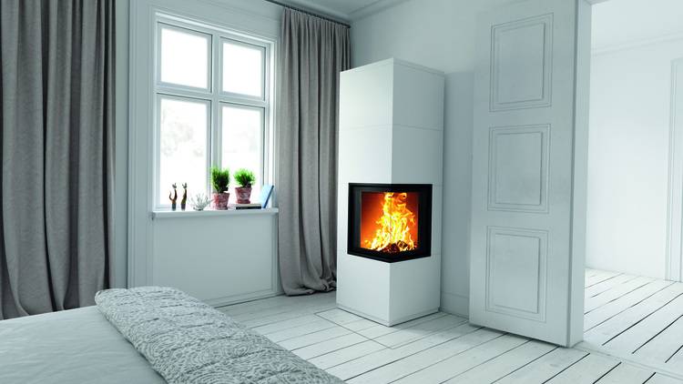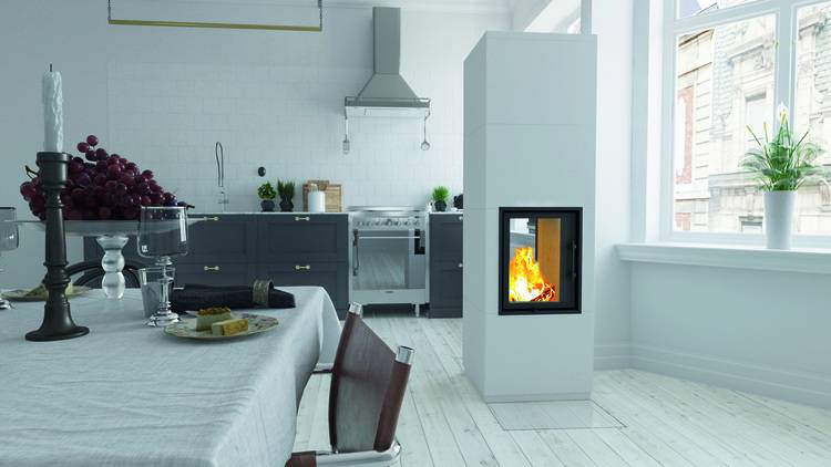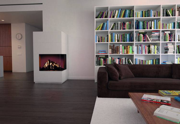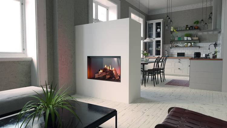 Der Gas-Kamineinsatz Lina G TV 87 von Camina & Schmid ermöglicht als Raumteiler eine Durchsicht von zwei Seiten.