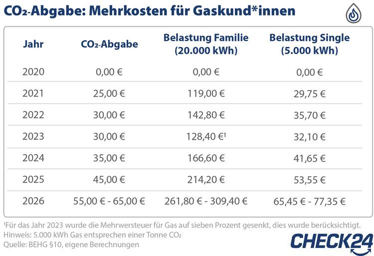 Aktuell kostet eine Kilowattstunde Gas laut dem CHECK24-Gaspreisindex 11,7 Cent. Die CO2-Abgabe verteuert die Heizkosten um fünf Prozent.2 Bis 2026 steigt der CO2-Preis schrittweise bis auf maximal 65 Euro pro Tonne an. Dadurch wird die Abgabe für eine Musterfamilie mit einem Verbrauch von 20.000 kWh auf maximal 309,40 Euro steigen. Die Gaskosten für die Musterfamilie erhöhen sich so voraussichtlich um 13 Prozent.