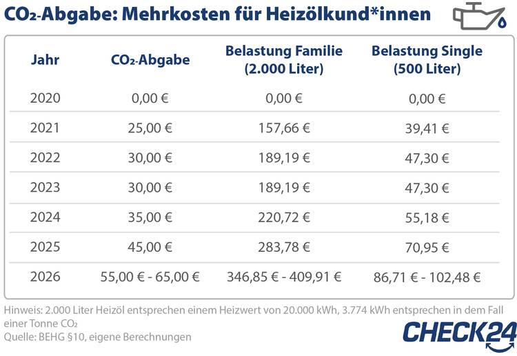 Der aktuelle Heizölpreis wird für Familien und Singles aufgrund des CO2-Preises um elf Prozent teurer. Bis 2026 erhöhen sich die Kosten für Heizöl durch die CO2-Abgabe um bis zu 23 Prozent, sowohl für eine Familie als auch für einen Einpersonenhaushalt. Eine Familie muss dann zusätzlich bis zu 409,91 Euro im Jahr an Mehrkosten zahlen, ein Single bis zu 102,48 Euro.4