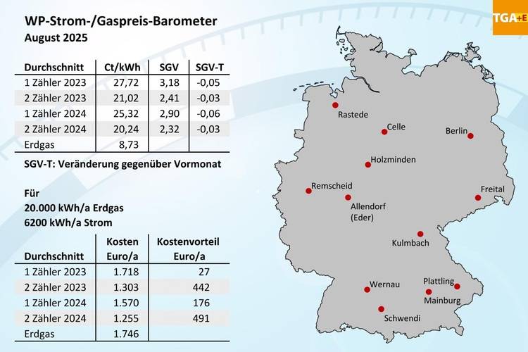 Wärmepumpen­strom-/Gas­preis­-Baro­meter im August 2025