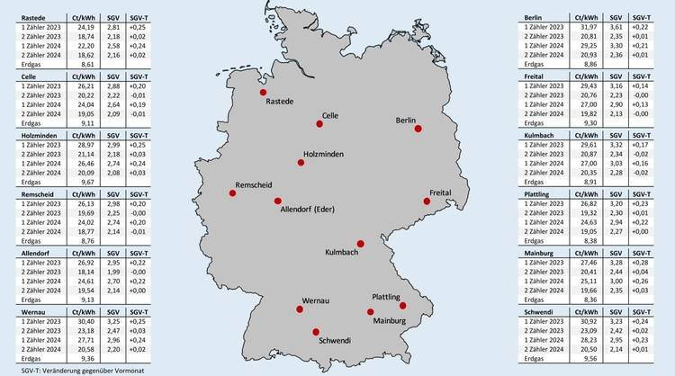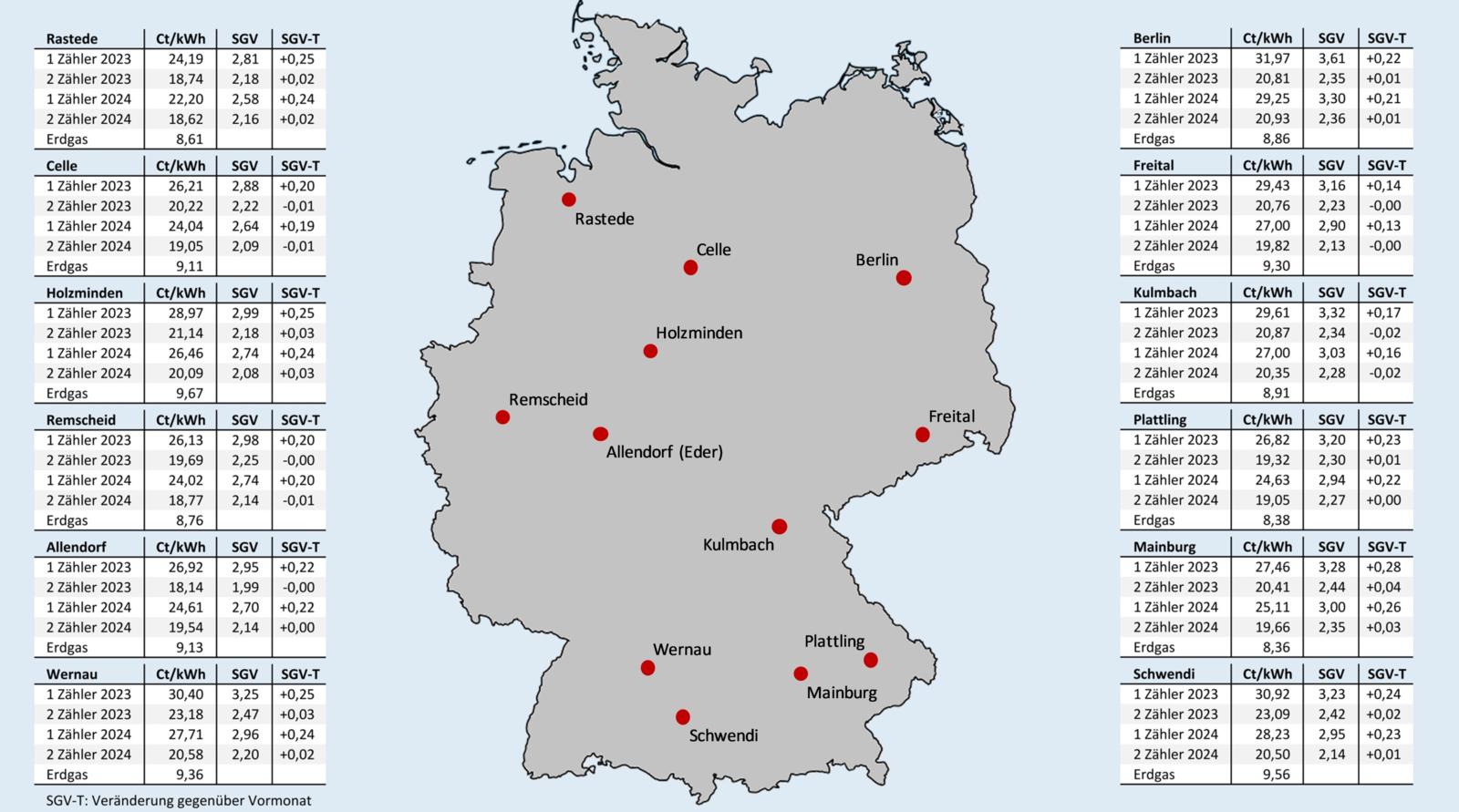 Der effektive Arbeitspreis für 3500 kWh/a Haushaltsstrom ist im Mittel um 0,70 Ct/kWh auf 26,50 Ct/kWh gesunken. Wärmepumpenstrom für 6200 kWh/a hat sich um 0,58 Ct/kWh auf 19,75 Ct/kWh (WP ab 2024 mit Modul 2) verbilligt. Das gemittelte SGV (für WP ab 2024 mit Modul 2) ist geringfügig um 0,01 Punkte auf 2,19 gestiegen und liegt in allen Referenzorten unter 2,36.