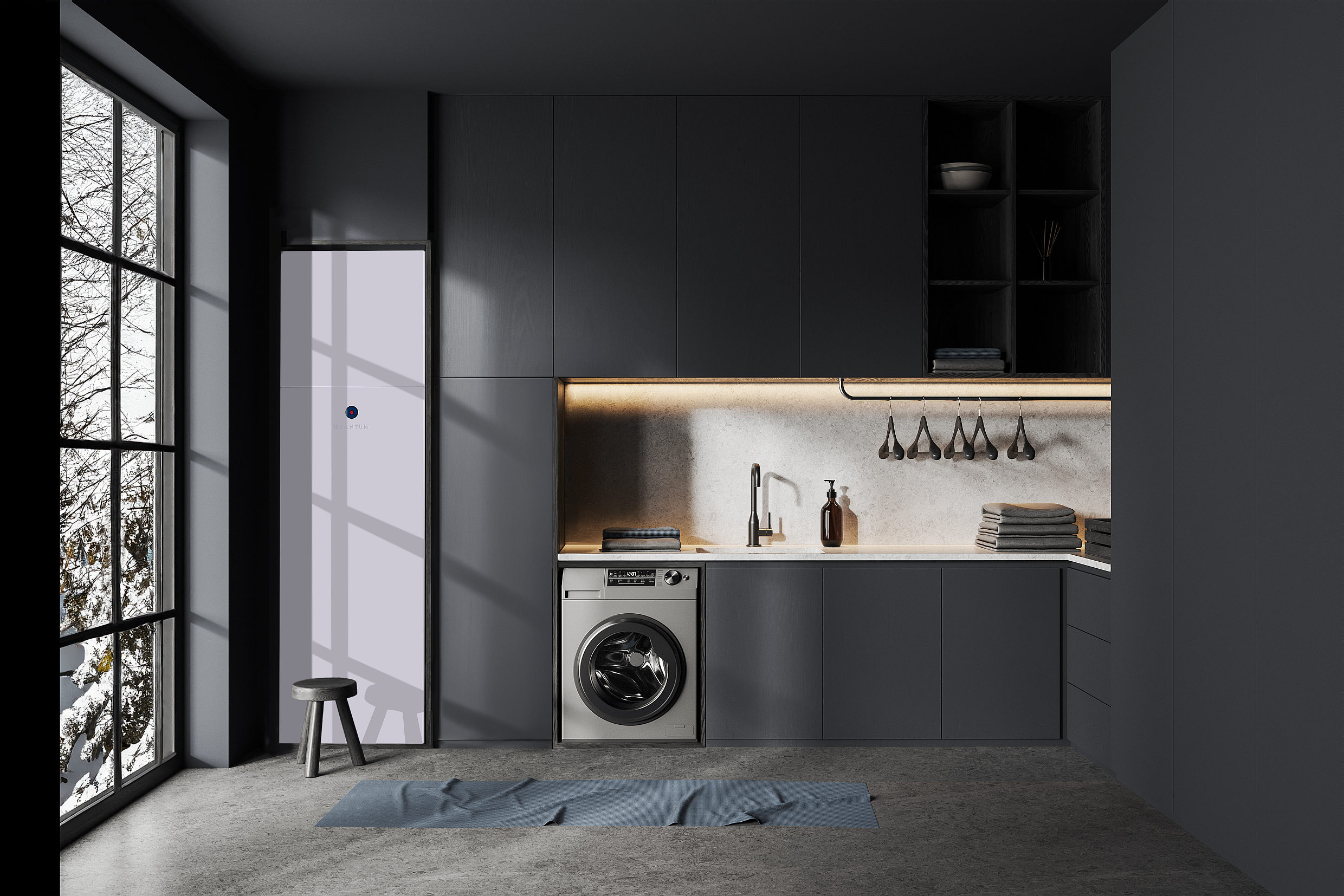 Deutlich einfacher: Die QE ist ein All-in-One-Gerät mit Wärmepumpe, Speicher, Lüftung und Regelung – alles in einem kompakten Gehäuse für die Innenaufstellung. Es gibt keine Außeneinheit, keine Abstandsüberprüfungen, keine Außenfundamente und keine Wanddurchführungen.