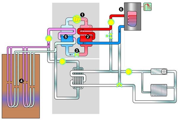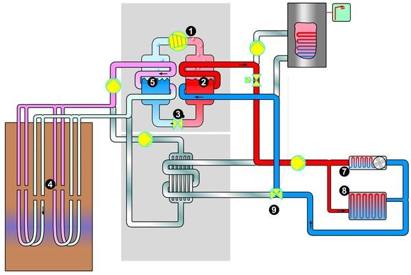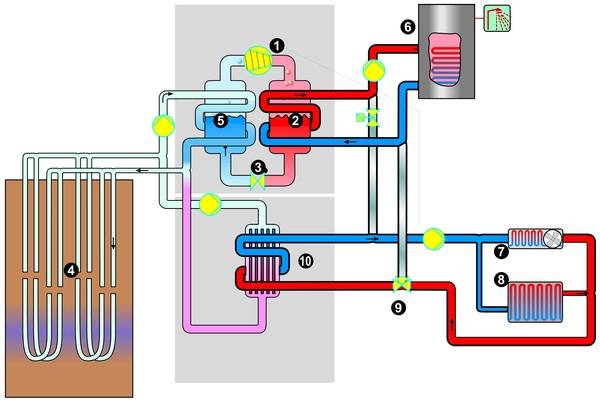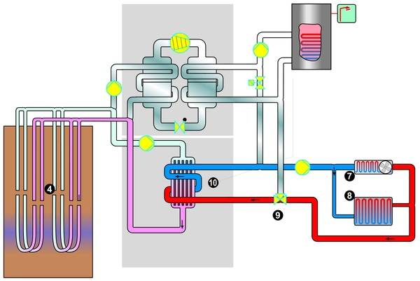 10. Durch Aktivieren der Sole-Umwälzpumpe wird in einem Wärmetauscher die Energie des Heizungswassers auf den Solekreis übertragen und in das Erdreich abgeführt.