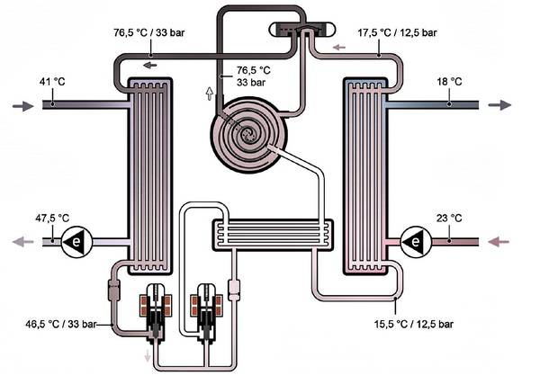1. Der Verdichter bringt das in einem geschlossenen Kreislauf zirkulierende Kältemittel auf ein höheres Temperaturniveau. Dabei steigt die Temperatur des gasförmigen Kältemittels.
