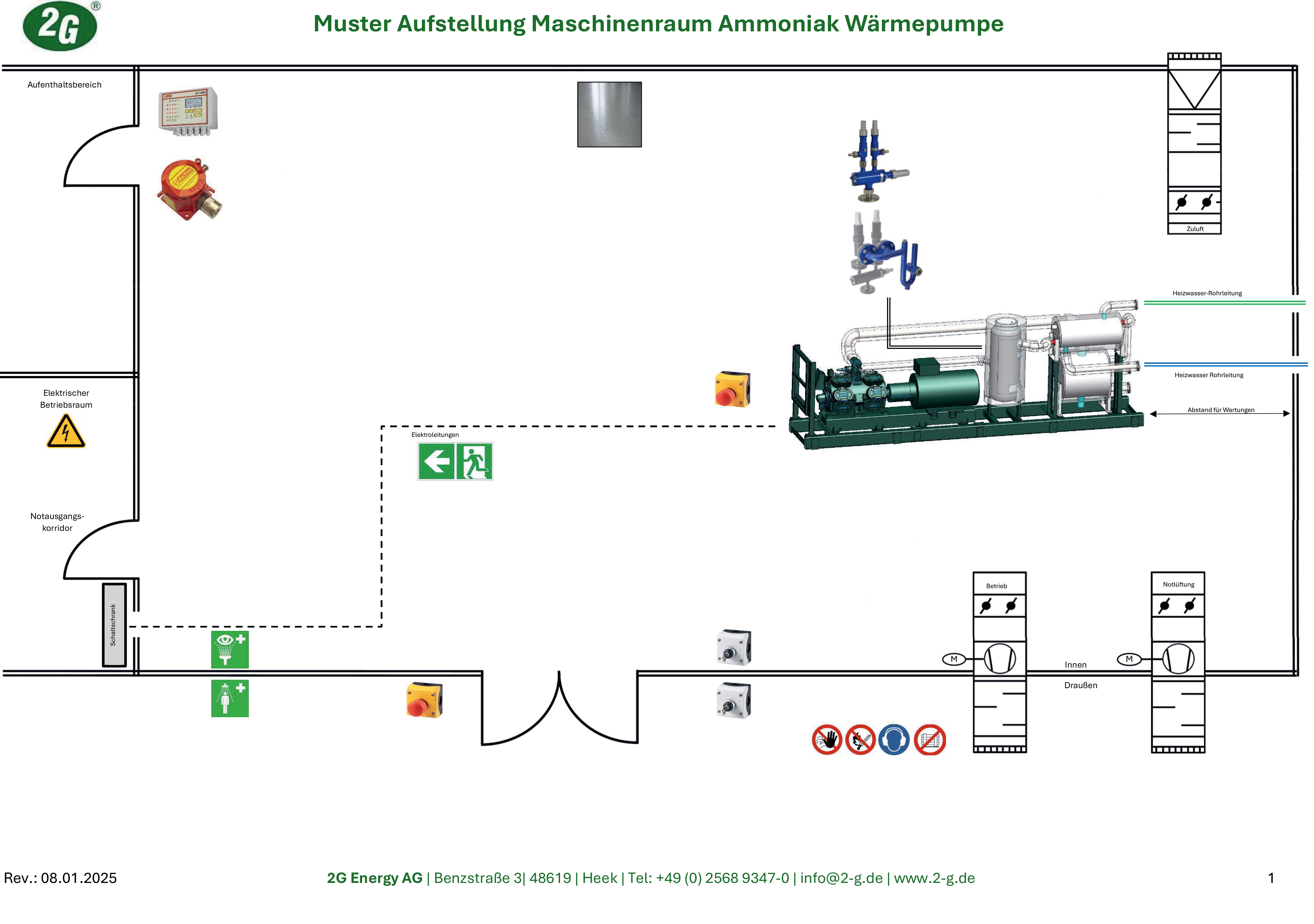 Der Maschinenraum, in dem die Ammoniak-Wärmepumpe aufgestellt ist, muss spezifische Anforderungen erfüllen, um die Sicherheit zu gewährleisten. Ein Maschinenraum ist ein abgeschlossener Raum oder Bereich mit mechanischer Belüftung, der gegenüber öffentlichen Bereichen abgedichtet ist und nicht für die Öffentlichkeit zugänglich ist. Er ist speziell dafür vorgesehen, die Bauteile der Wärmepumpe zu beherbergen. Ein Maschinenraum kann auch andere Anlagen beinhalten, sofern deren Konstruktion und Einbau den Sicherheitsanforderungen der Kälteanlage entsprechen. Es muss eine Mindesthöhe von 2,1 m über dem Boden für Laufwege und Arbeitsbereiche im Maschinenraum gewährleistet sein.