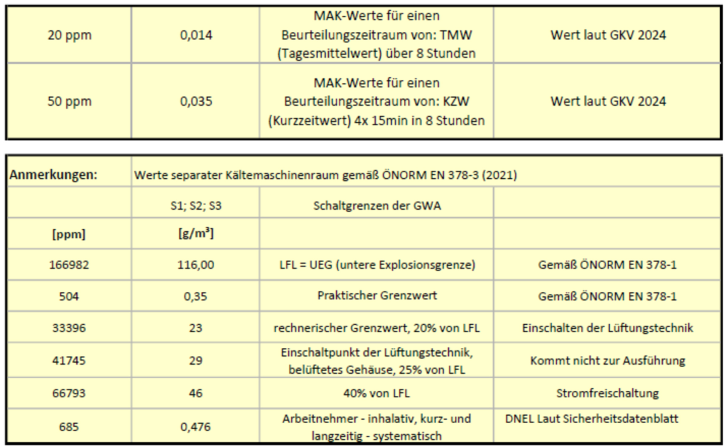 Wichtig ist der Hinweis auf die Konzentration im Leckagefall im Bezug auf die Zündfähigkeit. Die untere Zündgrenze (UEG = LFL) liegt bei 116 g/m³, also 166.982 ppm. Der Einschaltpunkt ein Lüftungstechnik zur Verdünnung und Senkung der Konzentration hat spätestens bei 20% vom LFL, also 23 g/m³ zu erfolgen.