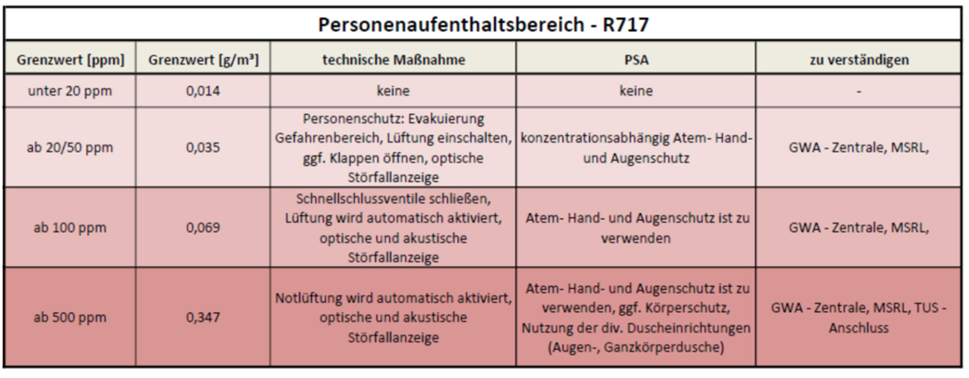 Ab einer Füllmenge von 50 kg Ammoniak muss ein Detektor installiert werden, der bei einer Konzentration von 350 mg/m³ (praktischer Grenzwert, 500 ppm) einen Voralarm und bei 21.200 mg/m³ (30.000 ppm) einen Hauptalarm auslöst (DIN EN 378-3 2020-12 9.3.3).