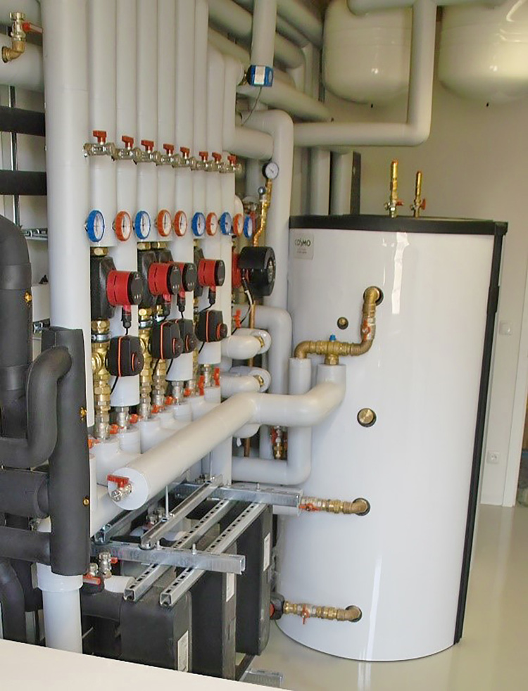Nicht benötigte Wärmeenergie kann zum Beispiel in einem Wassertank gespeichert werden. Bei einer Kombination dieses Heiz- und Kühlsystems mit einer Photovoltaikanlage lässt sich sogar der Strombedarf zum Betrieb der Wärmepumpe weitgehend decken.