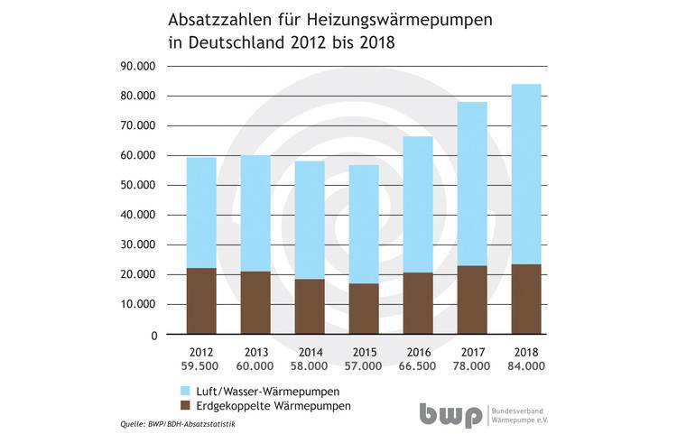 Anhand der gemeinsam mit dem Bundesverband der Deutschen Heizungsindustrie erhobenen Zahlen ist ersichtlich, dass auch der Absatz von Warmwasserwärmepumpen verglichen mit dem Vorjahr um 11 Prozent angestiegen ist: es wurden 15.000 Geräte verkauft. Im Jahr 2018 wurden somit insgesamt 99.000 Wärmepumpen auf dem deutschen Markt abgesetzt. Für das laufende Jahr rechnet der Verband mit einer Fortsetzung des Wachstumstrends.