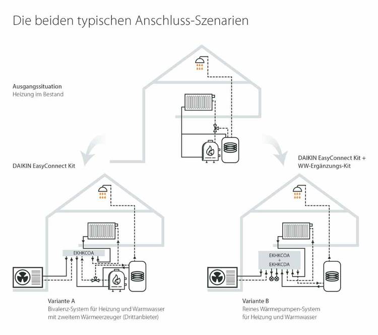 Variante B: Anschluss von Daikin EasyConnect Kit und Warmwasser-Ergänzungs-Kit für ein reines Wärmepumpensystem für Heizung und Warmwasser.