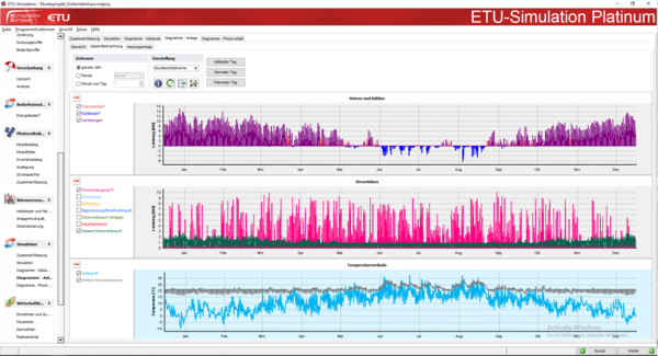 Mit dem Paket „ETU-Simulation“ präsentiert Hottgenroth/ETU eine durchgängige Lösung. In dieser Simulation werden u.a. dynamische Faktoren des Gebäudebetriebs (Wetterbedingungen, Regelung, Raumnutzung, Bauteilspeicherung, u.a.) sowie interne Gewinne durch z.B. Personen, Beleuchtung und Geräte berücksichtigt.