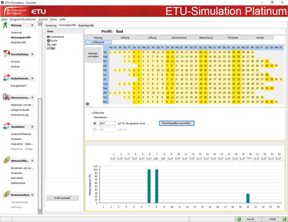Mit der neuen Version 4.1 wird die Luftfeuchte in allen Räumen stündlich berechnet. Der Feuchteeintrag ergibt sich aus den bereits für die Wärmeabgabe erfassten Personen sowie aus einem neuen Nutzungsprofil, in welchem zusätzliche Feuchtequellen, wie z.B. Kochen oder Duschen, erfasst werden. Der Außenluftwechsel kann die Innenluftfeuchte verringern oder auch erhöhen. Schließlich kann die Kühlung der Luft Feuchte entziehen, wenn diese an der Kälteabgabe kondensiert. Diese latente Kühlung kann Kühllasten und Kühlenergiebedarf beträchtlich erhöhen.