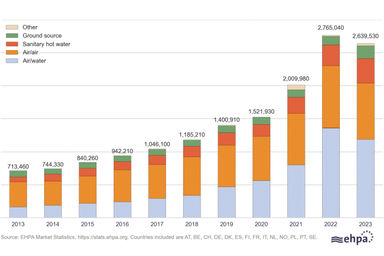 Der Wärmepumpenmarkt in Europa war im Jahr 2023 zum ersten Mal seit zehn Jahren rückläufig. Dies zeigen aktuelle Zahlen des Europäischen Wärmepumpenverbands (EHPA). So sank der Absatz in 14 europäischen Ländern von insgesamt 2,77 Millionen auf 2,64 Millionen im Vergleich zu 2022 und damit um rund 5 %. Die analysierten Länder machten im letzten Jahr 90 % des europäischen Wärmepumpenmarktes aus.