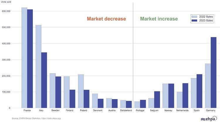 Frankreich, Italien, Schweden, Finnland, Polen, Dänemark, Österreich und die Schweiz verzeichneten im Jahr 2023 allesamt einen Rückgang des Wärmepumpenabsatzes. Demgegenüber stand ein Wachstum in Portugal, Belgien, Norwegen, den Niederlanden, Spanien und Deutschland. Dieses reichte allerdings nicht aus, um den Gesamtrückgang auszugleichen.