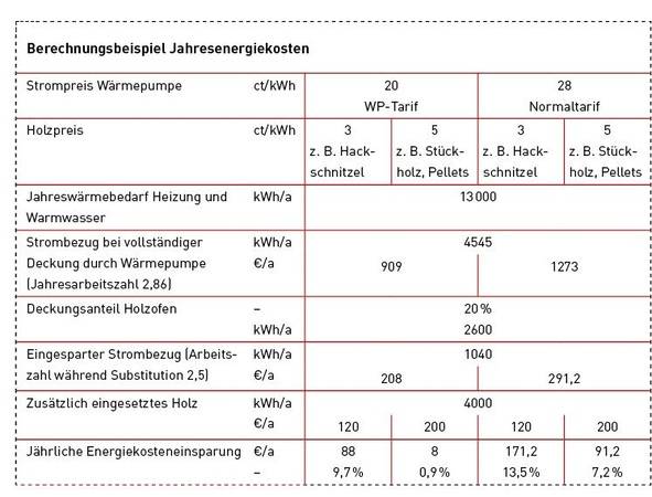 Das Berechnungsbeispiel bestätigt die zuvor dargestellten Einflüsse. Mit den hier unterstellten Randbedingungen zeigt sich der Einsatz eines Holzofens bei einem günstigen Stromtarif für Wärmepumpen und bei Einsatz von Stückholz oder Pellets nahezu energiekostenneutral. Können hingegen Hackschnitzel oder anderweitig preisgünstigeres Holz verfeuert werden und verdrängen hierbei Antriebsstrom für Wärmepumpen, welcher zum Normaltarif bezogen werden müsste, bewirkt der Einsatz des Holzofens eine Energiekosteneinsparung von etwas mehr als 13 %. Bei Strombezug zum Normaltarif und Einsatz von Stückholz oder Pellets ergibt sich für die beispielhafte Betrachtung eine Verringerung der Energiekosten um ca. 7 %. Bei höheren Deckungsanteilen des Holzofens – z. B. in langen Wintern/Übergangsperioden – können sich höhere Einsparungen ergeben.