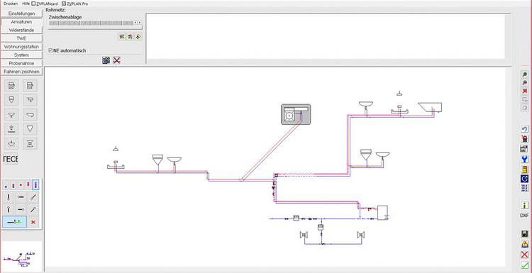 Es geht noch mehr. In unserem Beispiel wird noch ein Bad im Erdgeschoss saniert und dabei werden ungefähr 10 m Zirkulationsleitung im Keller ersatzlos entfernt. Außerdem werden 6 m Rohr im Keller durch einen kleineren Durchmesser ersetzt. Die restliche Leitung ist nicht zugänglich und verbleibt. Dass so ein Umbau ohne Komforteinbuße möglich ist, wird an den Ausstoßzeiten, bis warmes Wasser kommt, ersichtlich. Die Kontrollberechnung mit ZVPlan ist in wenigen Minuten erledigt. In Summe dürften sich die Verluste auf etwa 120 kWh Strom reduzieren lassen.