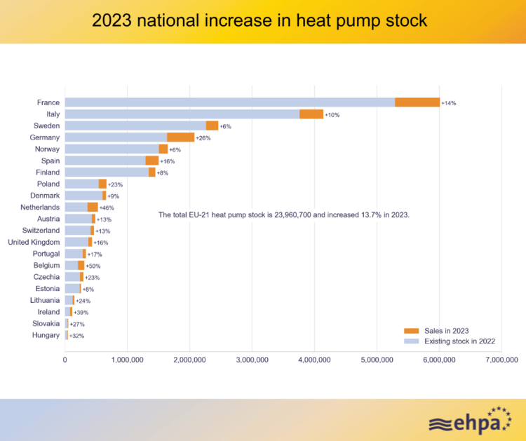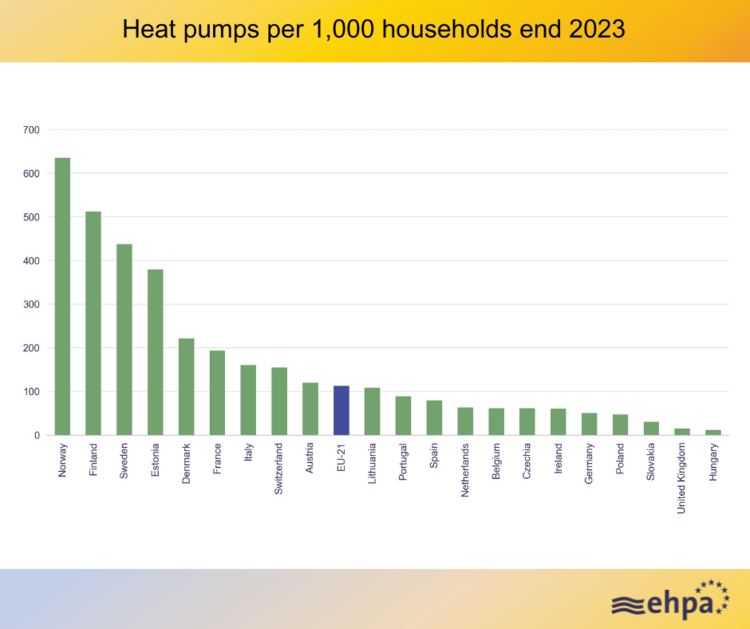 Bezogen auf den Wärmepumpenbestand (d.h. alle installierten Wärmepumpen) pro 1.000 Haushalte liegt Norwegen mit 635 an der Spitze, gefolgt von Finnland mit 512 und Schweden mit 438. Am anderen Ende liegen Ungarn mit 12 Wärmepumpen pro 1.000 Haushalte, das Vereinigte Königreich mit 15 und die Slowakei mit 30.