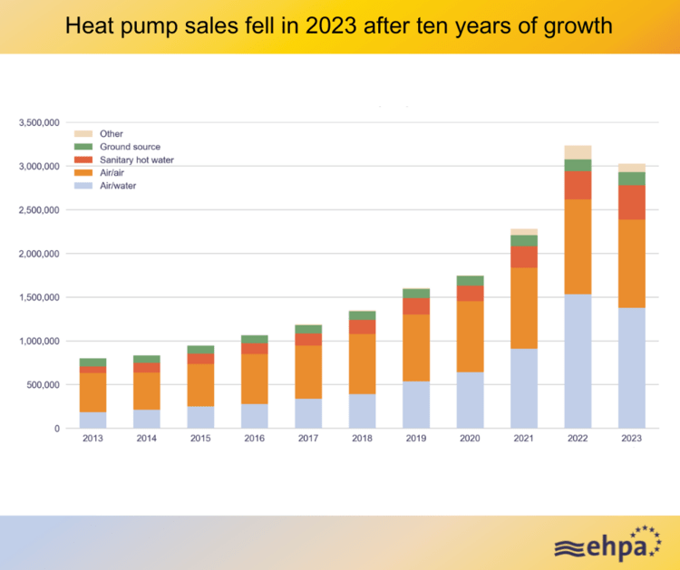Daten aus 21 europäischen Ländern*, die von der European Heat Pump Association erhoben wurden, zeigen, dass der Wärmepumpenabsatz im Jahr 2023 um 6,5 % unter dem des Vorjahres lag - der erste Rückgang nach zehn Jahren jährlichen Wachstums. Mit den 3,02 Millionen verkauften Wärmepumpen im Jahr 2023 steigt die Gesamtzahl der in europäischen Gebäuden installierten Wärmepumpen auf 23,96 Millionen - ein Anstieg von 13,7 % gegenüber 2022.