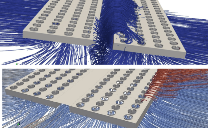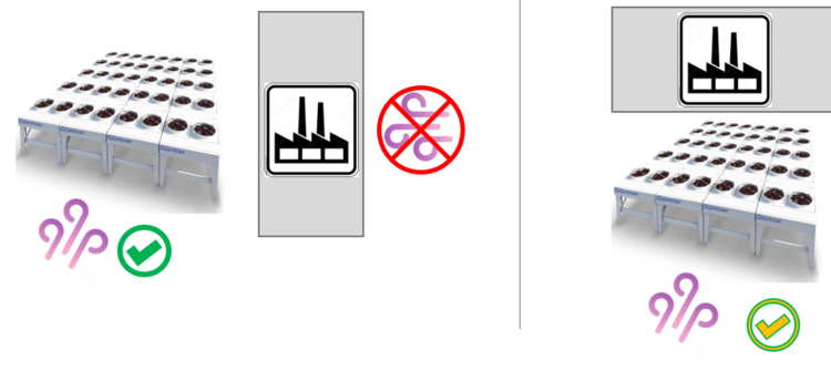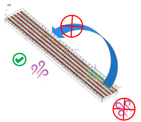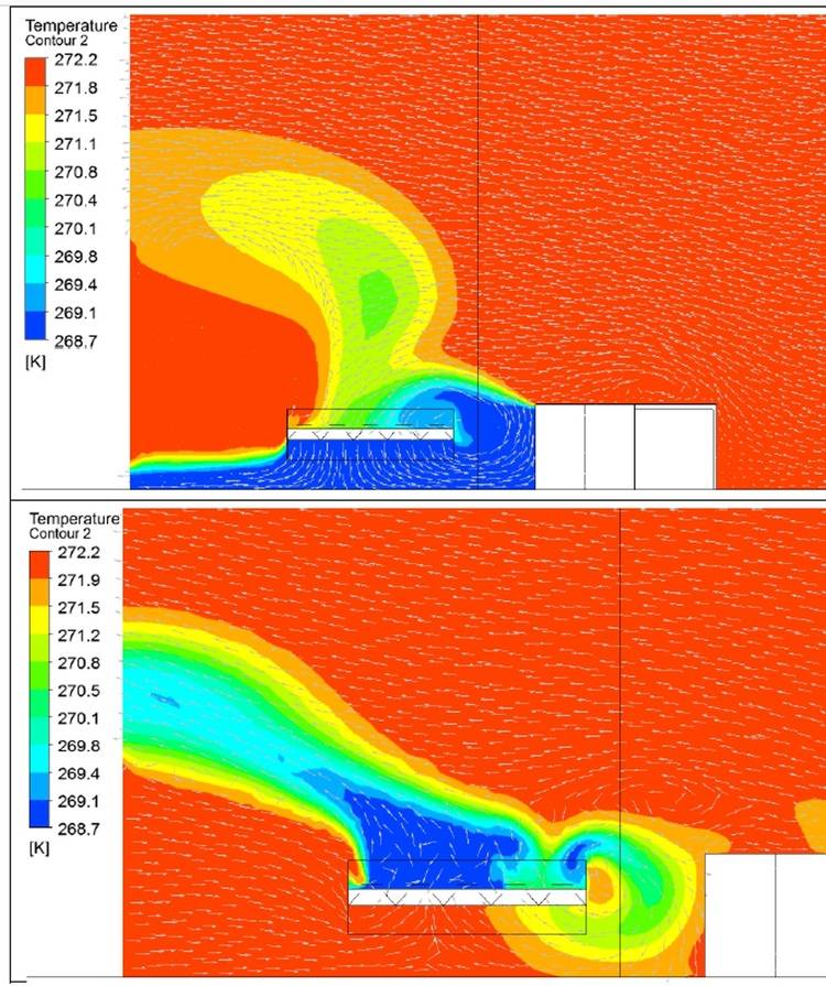 Eine überwiegend geringere Rezirkulation ergibt sich, wenn Gebäude und Hindernisse parallel zur Hauptwindrichtung oder hinter dem Verdampferfeld (wenn die Abluft darüber/seitlich weg strömen kann) angeordnet sind. Weitere Informationen liefert Bild 4: