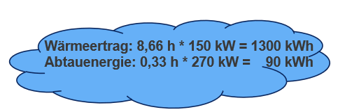 Nun könnte die Aussage getroffen werden, dass es nicht effektiv sei, 150 kW Wärmequellenleistung zu erzeugen, wenn 270 kW als Abtauleistung benötigt werden. Es lohnt der Blick auf die Energiemengen. Der Wärmertrag beläuft sich auf 1.300 kWh (8,66 h x 150 kW), die eingesetzte Abtauenergie schlägt mit 90 kWh (0,33 h x 270 kW) zu buche. Somit wird eine deutlich positive Energiebilanz erreicht.