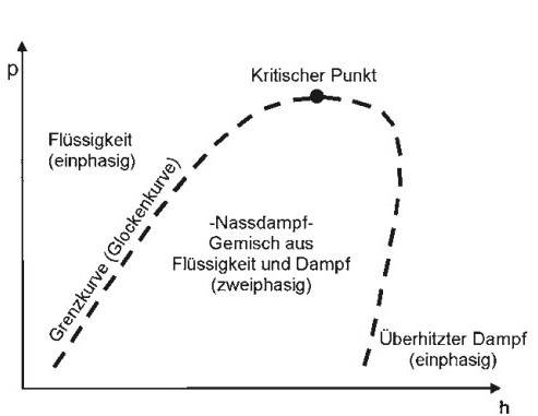 Links von der Grenzkurve ist das Kältemittel flüssig (einphasig), zwischen beiden Grenzkurven liegt ein Gemisch aus Flüssigkeit und Dampf (zweiphasig) vor, dies ist der so genannte Nassdampf. Der Dampfanteil wird über die Kurvenlinien in der „Glocke“ angezeigt. Durch eine weitere Enthalpieerhöhung wird die rechte Grenzkurve erlangt, dort hat sich der letzte Flüssigkeitstropfen in Dampf verwandelt, und es liegt einphasiger, trockener, gesättigter Dampf vor. Rechts davon kann durch weitere Wärmezufuhr das Gebiet des überhitzten Dampfes erreicht werden. Der kritische Punkt ist der Gipfelpunkt der Grenzkurve. Dies ist der Punkt, an dem die Gasphase und flüssige Phase des Kältemittels die gleichen Eigenschaften haben; kritische Temperatur, Druck und Volumen fallen im kritischen Punkt zusammen. Oberhalb der kritischen Temperatur oder des kritischen Druckes existiert keine Trennung mehr zwischen Flüssigkeit und Gasphase.