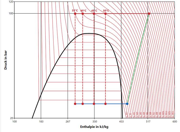 Die Verfügbarkeit dieses Kältemittels ist sichergestellt, aus umweltrelevanter Sicht gibt es keine gesetzlichen Verbote, der Anschaffungspreis für das Gas ist sehr gering, der Einsatz mit einer sehr hohen Reinheit (> 99,995%) ist obligatorisch. Je nach Arbeitsbereich können Drücke bis zu 140 bar auftreten, dies ist bei der Material- und Komponentenwahl sowie der normativ vorgeschriebenen Sicherheitseinrichtungen konstruktiv durch den Hersteller zu lösen und beherrschbar. Der kritische Punkt ist bei 31,1°C und 73,8 bar, aus diesem Grunde wird bei Wärmepumpenanwendung der transkritische Prozess ausgenutzt. Dieser wird nachfolgend im T- s Diagramm erklärt.
